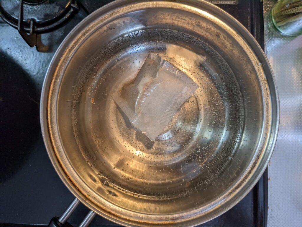 出汁パック1個と水600ccを入れ出汁を取ります。
